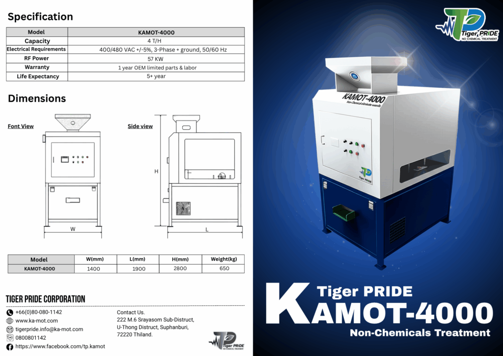 - กำลังการผลิตสูง : ด้วยความสามารถในการกำจัดมอดและไข่มอดในอัตราสูงถึง 4 ตันต่อชั่วโมง (4 T/H) จึงเหมาะสำหรับการใช้งานในระดับอุตสาหกรรม